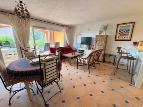 Cet appartement idéalement situé au rez-de-jardin a une belle loggia, une place de parking privée et une cave. Il se situe dans le coin chic du golf 18 trous à 5min de la mer, avec une grande piscine commune, 3 terrains de pétanque et 3 courts de tennis. Il se compose d'une entrée, des WC, un salon avec une cuisine ouverte et équipée. Le salon donne sur une grande terrasse avec la vue sur le jardin. La terrasse peut être entièrement fermée par des portes coulissantes en verre. 2 chambres complètent ce bien ainsi qu'une salle d'eau et une salle de bains. Peut être meublé ou non selon vos envies!